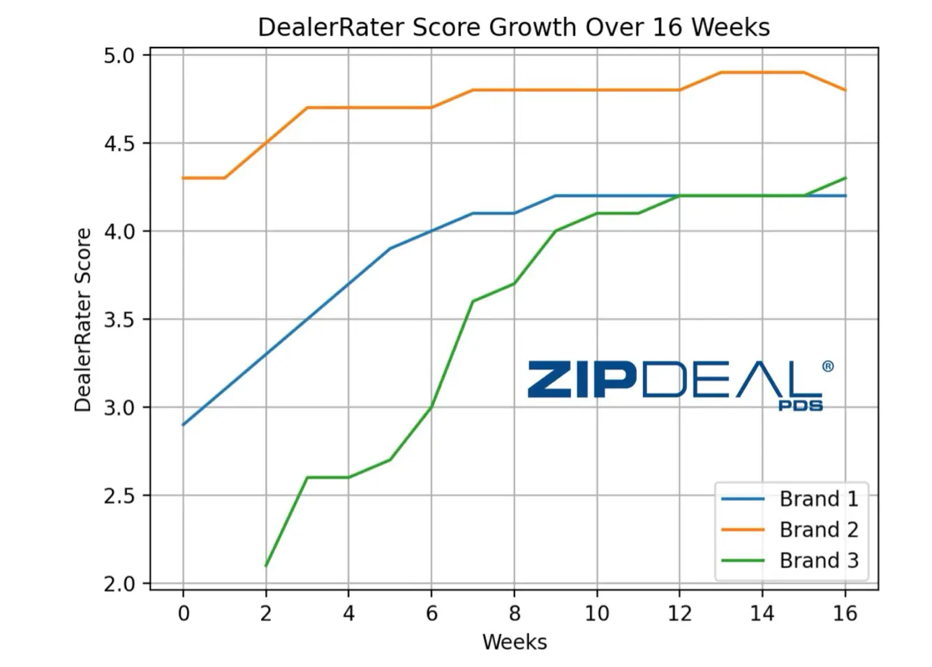 See how a dealer group transformed their DealerRater scores in just 9 weeks. Brand #1 rose from 2.9 to 4.2, Brand #2 strengthened to 4.8, and Brand #3 went from no rating to 3.9.
